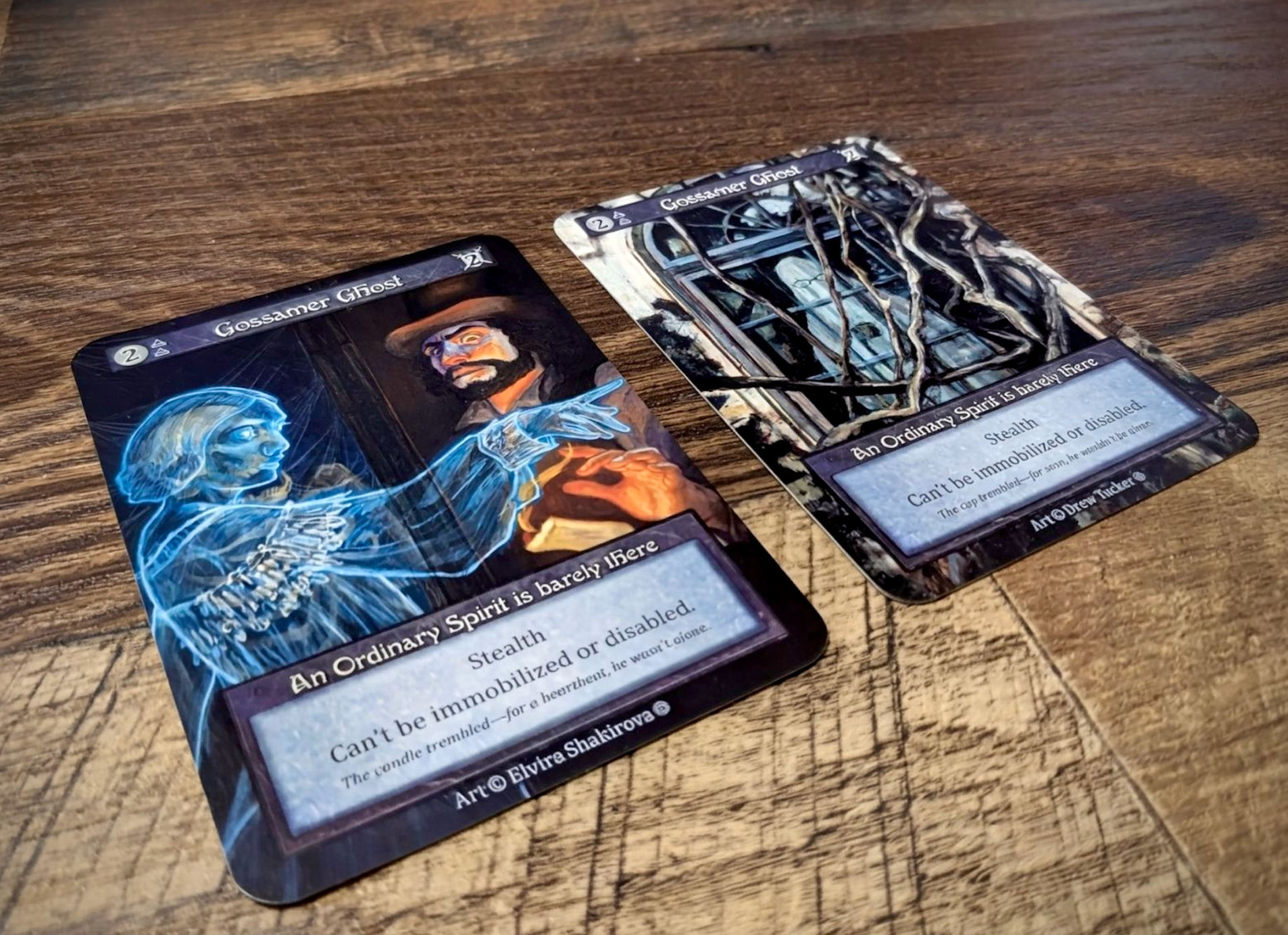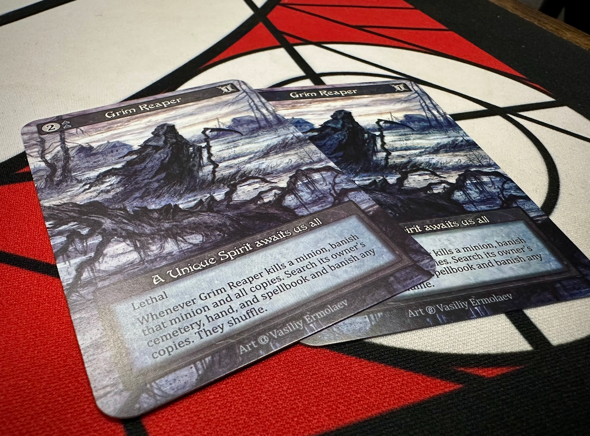 A few months after the Alpha set was delivered to backers, Beta was released more widely through traditional distributors and retailers. Alpha cards are denoted with an @ symbol at the bottom of the card, while Beta cards have a Beta symbol (see Bryce's Alpha and Beta Grim Reaper above).